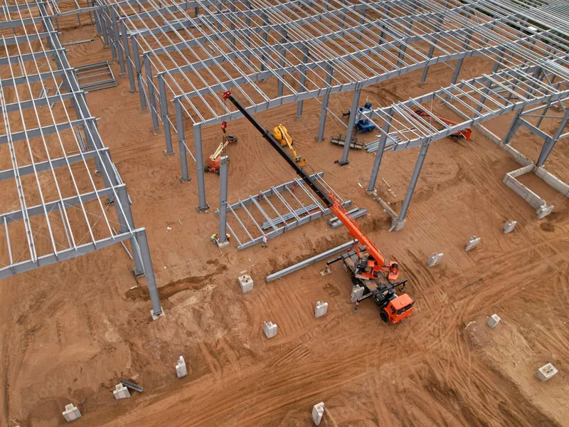 एक बार स्टील फ्रेम पूरा हो जाने के बाद, छत प्रणाली स्थापित हो जाती है। इसमें आमतौर पर अछूता धातु पैनल या एकल-प्लाई झिल्ली सामग्री शामिल होती है, जो स्थायित्व और थर्मल दक्षता दोनों प्रदान करती है। बाहरी दीवारें, यदि डिजाइन में शामिल हैं, तो धातु पैनलों, ईंट, या अन्य क्लैडिंग सामग्री का उपयोग करके स्थापित की जाती हैं। यह चरण मौसम प्रतिरोध और ऊर्जा दक्षता सुनिश्चित करते हुए गोदाम की सौंदर्य अपील को बढ़ाता है।